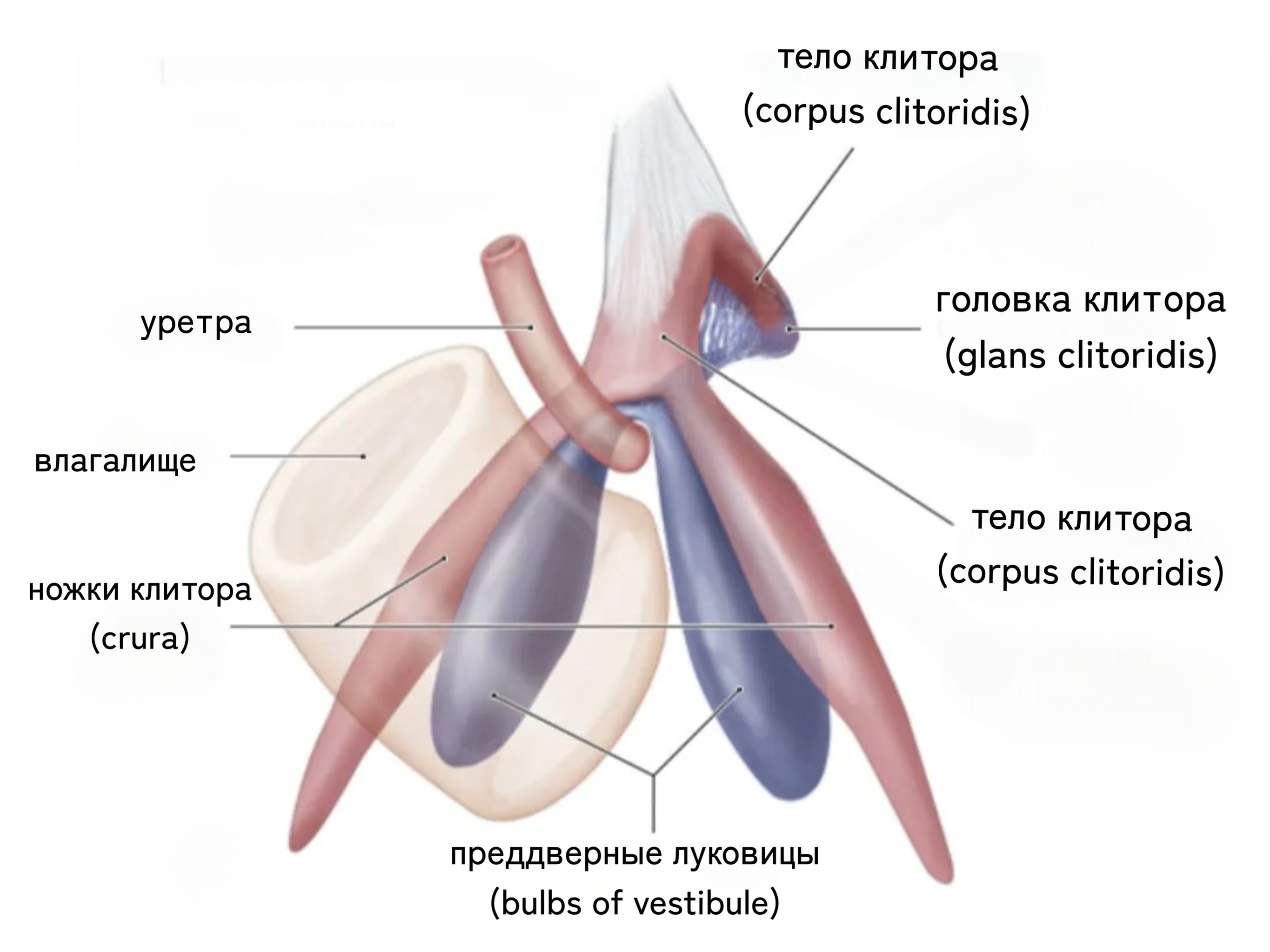 От головки вглубь таза уходит тело клитора (corpus clitoridis). Это пещеристая структура, которая при возбуждении наполняются кровью, увеличиваясь и становясь более упругой. Оно разделяется на две части, каждая длиной около 9-11 см, и они буквально «обнимают» влагалище с двух сторон.