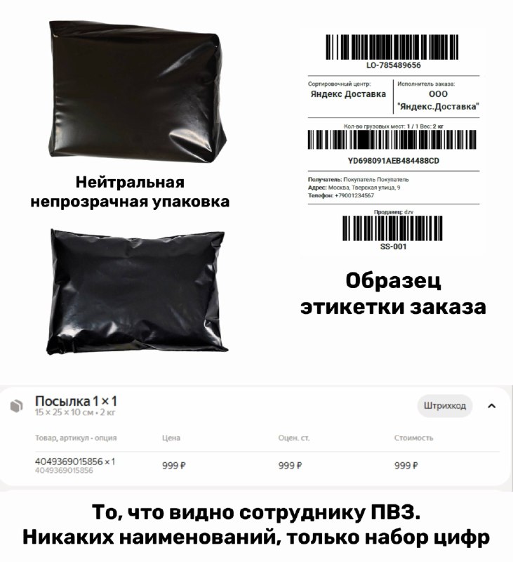 - Нейтральная упаковка: Заказ приходит в запечатанном непрозрачном черном пакете.